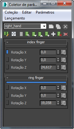 Coletor de Parâmetro permite classificar e apresentar os parâmetros animados, para que você possa acessar cujos conjuntos de parâmetros-chave possam ser selecionados com um ou dois cliques.. Ele tem o formato de uma caixa de diálogo redimensionável que regenera dinamicamente ao alterar parâmetros. A caixa de diálogo suporta a reordenação da Implementação de arrastar e soltar. Coleções são salvas com suas cenas e podem ser mescladas em outras cenas.
