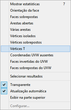 Todos os modos relativos a subobjetos: vértices, arestas e faces (geometria ou UVW). No entanto, você não precisa estar em um nível de subobjeto para que um verificador exiba os resultados. Os resultados do verificador aparecem no nível do objeto e em todos os níveis de subobjeto.