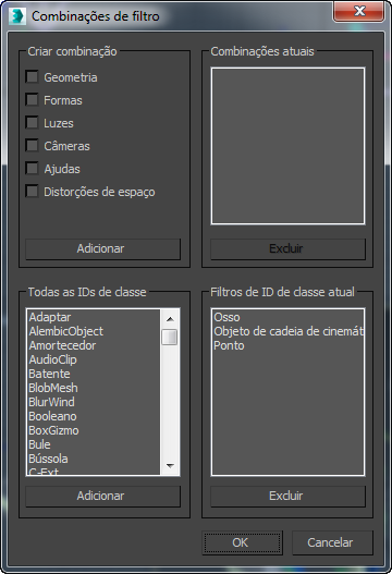 Lista as classes atuais para o filtro. Para excluir uma classe, selecione-a e clique em Excluir.