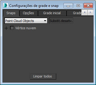 menu Alt: menu Cena > Grades e snaps > Configurações de grade e snap > caixa de diálogo Configurações de grade e snap > painel Snaps > Selecione Objetos da nuvem de pontos na lista suspensa.