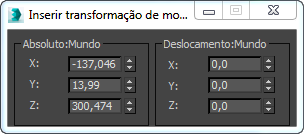 Os valores de deslocamento exibidos revertem para 0,0 após cada operação. Por exemplo, se você inserir 45 graus em um campo Rotacionar deslocamento, quando pressionar Enter, o 3ds Max rotaciona o objeto 45 graus a partir de sua posição anterior, aumenta o valor do campo Absoluto em 45 graus e redefine o campo Deslocamento como 0,0.