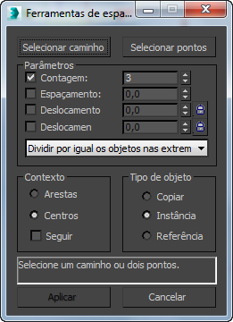 - Centro livre Distribui objetos igualmente espaçados ao longo de um linha reta em direção a ponto de fim do caminho, começando no início do caminho. Um spline ou um par de pontos define o caminho. É possível especificar o número de objetos e o espaçamento.