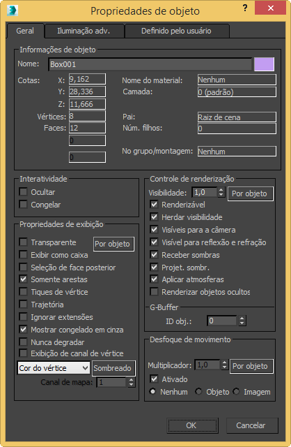 Este painel da caixa de diálogo Propriedades do objeto exibe informações gerais do objeto, bem como controles para renderizar o objeto e exibi-lo nas viewports.