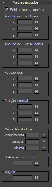 Esta implementação fornece leituras de valores relativos a todos os valores de transformação do objeto Expor Nó. Cada valor tem um botão denominado “M” próximo dele; clique neste botão para copiar o MAXScript associado ao valor à área de transferência, que você pode colar em um script posteriormente.