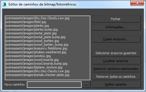 Mostra todos os bitmaps e arquivos fotométricos (IES, CIBSE, LTLI) utilizados na cena, junto com o caminho atual.