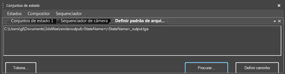 caminho RenderOutput. Para isso adiciona uma pasta com o nome do estado por meio do token {stateName} e o nome de arquivo {stateName}_output.tga. Portanto, por exemplo, se o nome do estado é BrightLight, seu resultado será um arquivo denominado