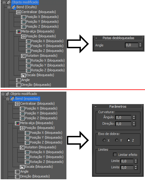 Por exemplo, na ilustração a seguir, a parte superior mostra a seção do objeto modificado da hierarquia de um objeto em que o modificador Dobra é aplicado. A trilha do nó do objeto estava bloqueada e em seguida, desbloqueada, e a trilha do ângulo do modificador foi desbloqueada. O resultado do painel Modificar aparece à direita.