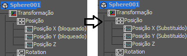 O bloqueio de uma trilha principal também bloqueia todas as trilhas secundárias. Por exemplo, se você bloquear a trilha de transformação/rotação de um objeto, suas trilhas de rotação X/Y/Z são bloqueadas também (assumindo o padrão Euler do controlador de rotação XYZ), portanto, impedindo que o objeto seja rotacionado.
