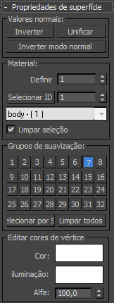 Esses controles permitem que você trabalhe com normais de patch, IDs de materiais, grupos de suavização e cores de vértices.