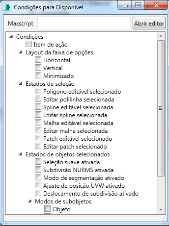 A caixa de diálogo Condições oferece uma lista de caixas de seleção para a escolha de condições predefinidas para elementos da faixa de opções; você também pode ajustar uma condição usando MAXScript.