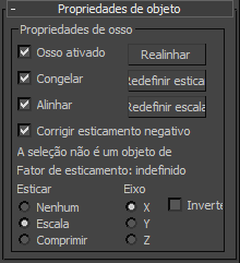 Nas opções de Corrigir esticamento negativo, há um texto que exibe informações sobre o número de ossos selecionados e o respectivo fator de esticamento para todos os três eixos. Se mais de uma estrutura for selecionada, o texto de Fator de esticamento exibirá indefinido.