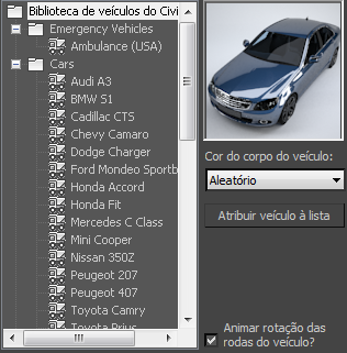 Permite que você escolha tipos de veículo do Civil View aleatórios ou individuais a serem aplicados a entradas selecionadas na lista de objetos de veículo.