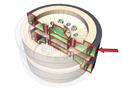 Nota: Ao usar Quando o corte é selecionado ou Manualmente, é possível deslocar a seção transversal gerada da posição da geometria de intersecção. À medida que você move o objeto de corte, as linhas amarelas de seção transversal se movem com ele, deixando a geometria para trás. Quando você clica em Criar forma, a nova forma é gerada nas linhas de seção transversal exibidas na posição de deslocamento.