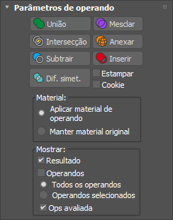 - Na implementação Parâmetros de operando, escolha a operação booleana a realizada: União, Interseção, Subtração, Mesclar, Anexar ou Inserir, ativando as opções Estampar ou Cookie, se necessário.