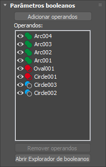 - Exibe os operandos envolvidos na criação da forma composta. Ícones coloridos mostram a operação booleana atualmente realizada, conforme mostrado na implementação Parâmetros de operando. A visibilidade de cada operando pode ser ativada e desativada ao se clicar no ícone de olho.