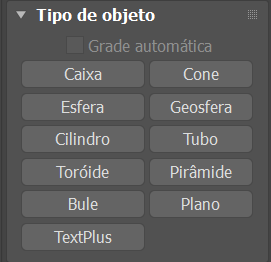 O 3ds Max inclui um conjunto de 11 primitivos básicos (consulte também Primitivos estendidos). Você pode facilmente criar primitivos com o mouse na viewport (consulte Criando um objeto), e pode ser gerado a em sua maioria a partir do teclado. Esses primitivos são listados na implementação Tipo de objeto e no menu Criar.