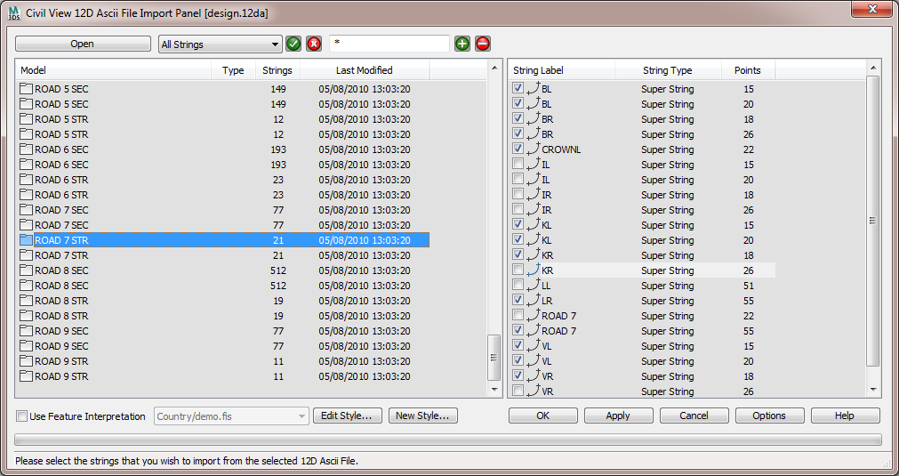 O Civil View suporta os seguintes tipos de stringo do 12D Model: