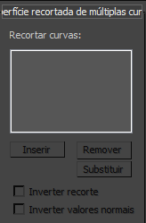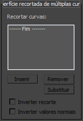 A lista de recorte mostra os nomes das curvas selecionadas. "Inverter recorte" inverte a direção de recorte. "Inverter normais" permite inverter as normais de superfície em tempo de criação. (Após criar a superfície, é possível inverter as normais usando os controles na implementação de superfície comum).