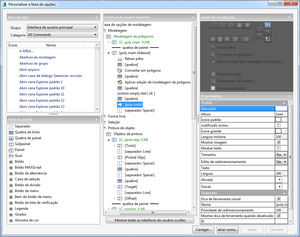 A caixa de diálogo Personalizar faixa de opções oferece uma variedade de ferramentas para editar a faixa de opções. É possível usar o mouse e o teclado para reorganizar os controles existentes, renomeá-los e alterar seus ícones. E o mais importante é que é possível adicionar controles com base em praticamente qualquer ferramenta no 3ds Maxou em novas ferramentas com base em scripts personalizados.