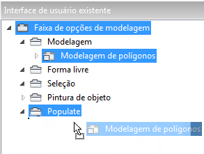 Por padrão, a lista contém apenas os recursos ativos na faixa de opções. Por exemplo, se nenhum objeto for selecionado, a ramificação das Ferramentas de modelagem do Graphite conterá somente o painel Modelagem de polígonos, mas se um objeto de polígono editável for selecionado, inúmeros painéis adicionais aparecerão nessa ramificação.