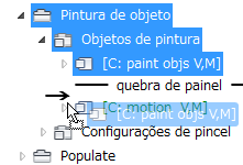 Quando você passar o mouse sobre a lista de interface do usuário existente, uma seta mostrará onde o item que você está arrastando será solto quando você soltar o botão do mouse. Se você pausar por alguns segundos sobre um item expansível, sua hierarquia expandirá para que você possa inserir o item arrastado na hierarquia. Nesse caso, isso não é desejável, por isso confirme se você soltou o botão do mouse antes de a hierarquia de Pintura de objeto ser expandida. Se ela não se expandir, solte o botão do mouse (provavelmente nada será adicionado), feche a hierarquia e tente novamente.