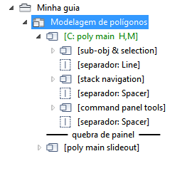 Agora você pode ver mais três subpainéis aninhados internamente, com separadores entre cada um. Eles definem as três áreas dentro do painel Modelagem de polígonos, que são organizadas horizontalmente. Você excluirá o subpainel central, identificado como [navegação da pilha] porque, na verdade, quem precisa navegar na pilha?