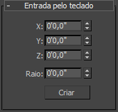 Crie a maioria das primitivas geométricas de teclado usando Entrada pelo teclado. Em uma única operação, você define o tamanho inicial de um objeto tridimensional e sua posição tridimensional. O 3ds Max atribui automaticamente o nome e a cor do objeto. Consulte Nome de objeto e cor de estrutura de arame.