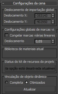 Os valores necessários aqui são os deslocamentos de coordenadas X e Y que colocam os dados do modelo importado o mais próximo possível da origem de coordenadas do 3ds Max (0,0), sem inserir espaço de coordenadas negativo. Por exemplo, se um modelo que você deseja importar ocupar uma região no MX entre 131531.567,452581.649 e 138746.235,456231.612, a maioria dos valores apropriados para inserir aqui seria X=–131500 e Y=–452500. Esses valores negativos de deslocamento colocam a coordenada inferior esquerda do modelo importado dentro de 100 metros da origem de coordenadas do 3ds Max, assegurando que a máxima precisão seja mantida no modelo de visualização.