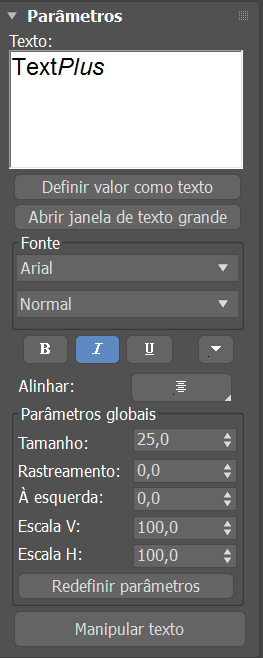 O TextPlus fornece um objeto de texto completo. Você pode criar um contorno de spline ou uma geometria sólida, com extrusão e chanfrada. As opções adicionais permitem aplicar diferentes fontes e estilos a cada caractere e adicionar animação e efeitos especiais.