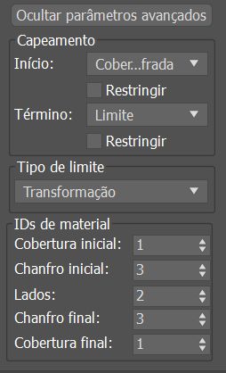 É possível aplicar materiais individualmente selecionados à Cobertura inicial, ao Chanfro inicial, aos Lados, ao Chanfro final e à Cobertura final.