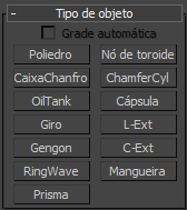 Além disso, para os primitivos padrão, 3ds Max inclui um conjunto de primitivos estendidos. É possível criar os primitivos com o mouse na janela de visualização (consulte Creating an Object), e pode ser gerado a partir do teclado. Esses primitivos estão listados na implementação Tipo de objeto e no menu Criar