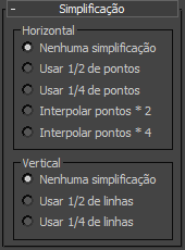 - Usar 1/2 das linhas Usa metade do conjunto de operandos do spline do objeto terreno para criar uma malha menos complexa. Isso resulta em menos detalhes e um arquivo menor que o uso de Nenhuma Simplificação.