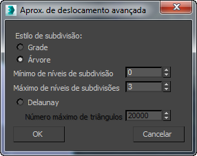 Níveis Máximos de Subdivisão Define o número máximo de recorrências. O máximo não pode ser maior que 7. Cuidado: definir o máximo maior do que 5 pode resultar em um baixo desempenho e enormes contagens de face. Padrão = 3.