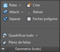 O painel Geometria (todas) fornece um subconjunto das ferramentas de modelagem da Implementação Editar geometria e adiciona Fechar polígono para criar um polígono de um vértice ou seleção de arestas e as ferramentas Quadrificar para conversão de polígonos para quadriláteros.