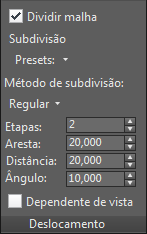Quando ativado, polígonos são subdivididos para deslocar com exatidão o objeto de polígono, utilizando o método e as configurações que especificam os grupos de Predefinições de subdivisão e Método de subdivisão. Quando desativado, o polígono é deslocado movendo os vértices existentes, a forma pela qual o Deslocar modificador faz. Padrão=desativado.