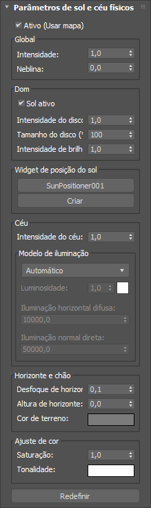 A implementação de Parâmetros de sol e céu físicos define parâmetros do mapa de Ambiente de sol e céu físico. Esta é a mesma implementação exibida para o mapa de Ambiente de sol e céu físico no Editor de material slate.