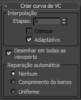Os controles desta caixa de grupo permitem que você especifique automaticamente reparameterization. São semelhantes aos controles na caixa de diálogo Reparametrizar, com uma adição: todas as opções, exceto Nenhum, informam ao 3ds Max para reparameterizar a curva automaticamente; ou seja, sempre que você editá-la, movendo VCs, refinando, e assim por diante.