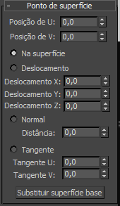 Se o ponto assentar na superfície, é possível movê-lo usando a transformação Mover. É possível também movê-lo usando o botão Mover ponto de superfície. Consulte Editar subobjetos de ponto. De qualquer forma, isto atualiza os valores da posição U e da posição V.