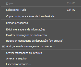 Clicar com o botão direito do mouse na Janela de mensagem de renderização exibe um menu suspenso com algumas opções para visualizar e gerenciar estas mensagens.