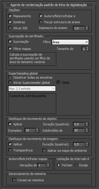 - Suavização de serrilhado suaviza as arestas com desvios que ocorrer ao longo das arestas da diagonal e curvas de linhas durante a renderização. Desativar somente quando você estiver renderizando as imagens de prova e velocidade é mais importante do que a qualidade da imagem.