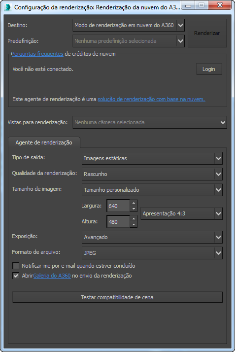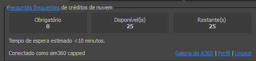 - Clique para efetuar login no Autodesk Cloud. Quando você se conecta, este painel mostra seus recursos, o tempo de espera estimado e os links para a interface do Autodesk Rendering.