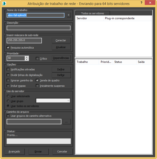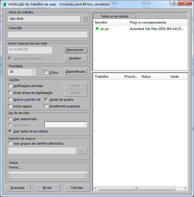 Por padrão, todos os servidores que estiverem listados contribuirão para o trabalho de renderização. Se quiser atribuir um determinado servidor para renderizar um trabalho, primeiro desative a opção Utilizar todos os servidores no grupo de Opções e, em seguida, realce os servidores desejados para fazerem a renderização do trabalho.