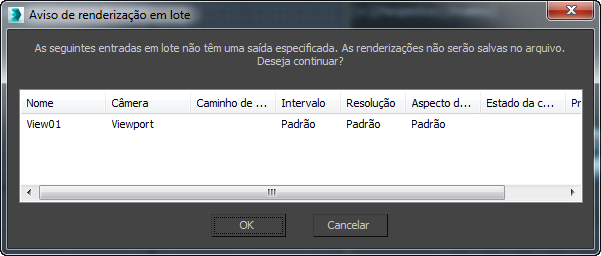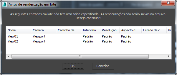 Ambos os formatos da caixa de diálogo de aviso da renderização em lote incluem a fila de tarefas das colunas que são exibidas na caixa de diálogo de renderização em lote. A diferença chave é a exceção das caixas de seleção que permite especificar quais câmeras são utilizadas na renderização. Esta fila de tarefa apenas exibe as câmeras que podem sobrescrever um arquivo salvo ou que não tem um caminho/nome de arquivo de saída ou caso elas mostrem um caminho de saída inválido.
