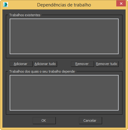 Essa caixa de diálogo permite especificar os trabalhos que não devem começar a renderização até que outros trabalhos sejam concluídos. Utilize as duas listas e os botões Adicionar e Remover para criar uma lista de trabalhos que devem terminar a renderização antes de o trabalho atual ser iniciado.