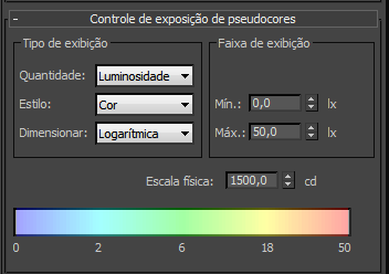 Na verdade, o Controle de exposição de pseudocor é uma ferramenta de análise de iluminação que oferece a você uma forma intuitiva de visualizar e avaliar os níveis de iluminação em suas cenas. Ele atribui os valores de luminosidade ou iluminação a pseudocores que mostram o brilho dos valores que estão sendo convertidos. Do mais escuro ao mais claro, a renderização mostra azul, ciano, verde, amarelo, laranja e vermelho. (Como alternativa, você pode selecionar uma escala de cinza onde os valores com mais brilho são brancos e os mais escuros são pretos). A renderização inclui a barra de espectro de cores ou de escala de cinza como uma legenda para a imagem.