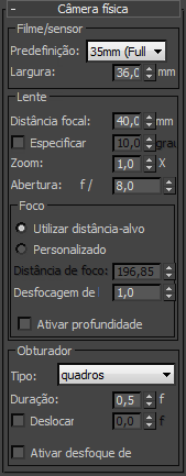 Desfocagem de lentes Ajusta o campo de visão aproximando ou distanciando a lente em relação à distância do foco. Um valor de 0.0 para Desfocagem de lentes desativa esse efeito. Padrão=1,0.