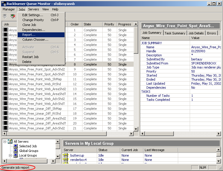 Lista de estruturas no trabalho (em “ID de Tarefa”), junto com cada status da estrutura, o tempo de renderização, o servidor de renderização, e data e hora da atribuição.