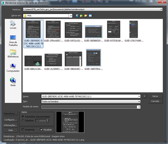 Nota: Para renderizar uma sequência de imagens estáticas, escolha o Segmento de tempo ativo ou defina um intervalo de quadros na implementação Parâmetros comuns da caixa de diálogo Configuração de renderização. Se estiver renderizando para um tipo de arquivo de imagem fixa, o 3ds Max anexa um número de quadro com quatro dígitos ao nome do arquivo, incrementado a cada quadro.
