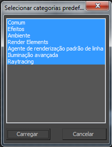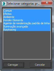 Cada categoria corresponde a um painel da caixa de diálogo Configuração de renderização. Selecione que configurações do painel você deseja carregar do arquivo RPS e, em seguida, clique em Carregar. Uma vez que você carregar um arquivo predefinido personalizado, seu nome aparece na lista suspensa, juntamente com as opções padrão.