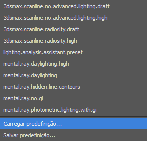 Além das predefinições padrão que vêm com o 3ds Max, é possível criar suas próprias. Na parte inferior da lista de predefinições, duas opções permitem-lhe usar e criar suas próprias predefinições personalizadas: